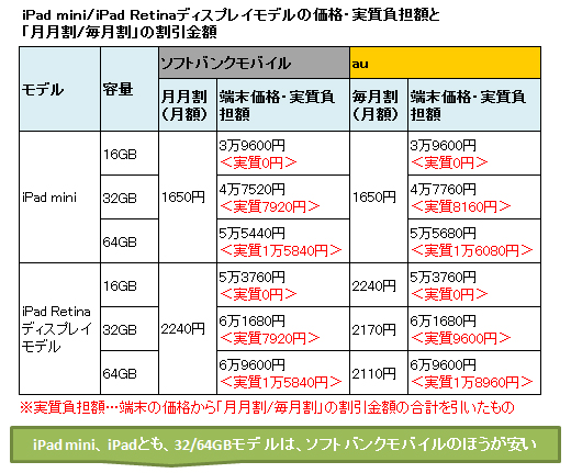 ただし「分割払い」だと容量によって毎月の支払い金額が変わってくるので、今回は「一括払い」を前提に比較した。筆者が「一括払い派」という理由もある。最も安い「iPad mini」の16GBモデルの価格は、ともに3万9600円。32GB/64GBモデルは、ソフトバンクモバイルのほうが240円安い。対して「第4世代iPad」は、16GB/32GB/64GBとも、キャリアによる価格差はない。