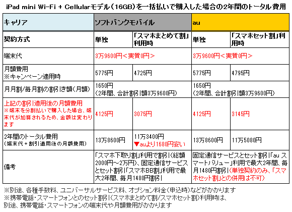 iPhoneを含む携帯電話・スマートフォンとiPadの2台を同一名義で契約し、所定の条件を満たしたセット割引(ソフトバンクモバイルは「スマホまとめて割」、auは「スマホセット割」)の場合は、通常のキャンペーンの割引に加えて、基本使用料からソフトバンクモバイルの場合は1050円、auの場合980円、さらに割引される。これら二つのキャンペーン適用後の月額料金(最大2年間)は、ソフトバンクモバイルが4725円、auは4795円。差はひと月あたりわずか70円だが、2年間のトータルでは1680円と、無視できない金額になる。