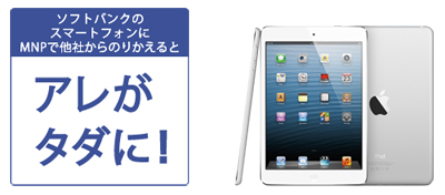 「スマホタダ割」の特典は、月額980円のホワイトプラン基本使用料2年間無料(割引額合計2万3520円)とソフトバンクポイント5280ポイント、ソフトバンクポイント2万8800ポイント、MNPと同時にiPad mini/iPad Retinaディスプレイモデル(第4世代iPad)のWi-Fiモデルを購入した場合に最大24か月間、毎月の請求から1200円割引(割引額の合計2万8800円)の三つ。割引相当額はいずれも2万8800円で、「iPhone 5」を2年間継続して使用すれば、2万8800円の「iPad mini Wi-Fiモデル」の16GBモデルが実質無料になるという大盤振る舞いだ。iPhoneと同じiOSを搭載したiPadで、通信機能を備えたWi-Fi + Cellular(セルラー)モデルに加え、Wi-Fiモデルも取り扱うソフトバンクモバイルならではのキャンペーンといえるだろう。