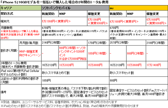 12月7日からは、「iPhone 5」に機種変更するユーザー向けに、指定の条件を満たすと、1年間、パケット定額サービスの料金から毎月1050円割り引く「かいかえ割」を開始した。11月30日まで実施していた「iPhone かいかえ割」に相当するキャンペーンで、受付けは2013年1月31日まで。なお、「iPhone 5」の端末価格(一括払い時の販売価格/分割払い時の総支払い金額)は、両キャリアとも発売当初から変更はなく、同じ容量同士ではいずれもソフトバンクモバイルのほうが1万320円安い。
