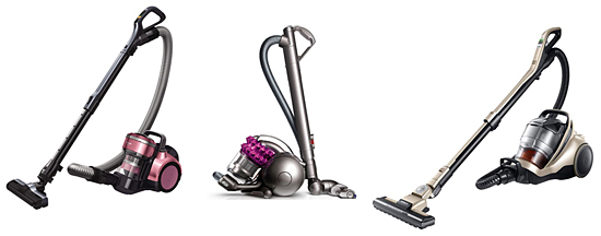 左から、東芝の「TORNEO V VC-S312」、ダイソンの「DC46」、日立アプライアンスの「2段ブーストサイクロン CV-SW7000」