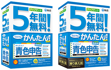 「ミロクのかんたん!青色申告7」、左が通常版、右が乗り換え版