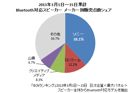 1位は、手のひらに載るコンパクトで丸いフォルムが人気のソニー「SRS-BTV5」で、46.4%の高いシェアを獲得。「SRS-BTX500」の姉妹モデル「SRS-BTX300」は5位で、幅広いラインアップをもつソニーは、3月上旬のBluetooth対応スピーカー市場で38.1%で1位になった。