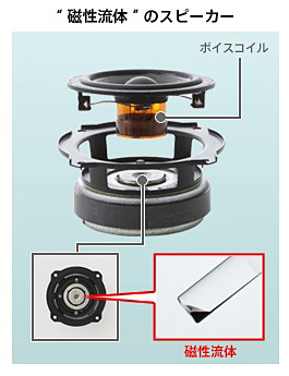 左右のスピーカーには、独自開発の「マグネティック・フルーイド・スピーカー」を採用。ダンパー代わりの磁性流体サスペンション構造が、ボイスコイルから振動板へと伝えられる駆動力の機械的損失や反共振によるひずみを低減し、反応の早い伸びのある中高域を再生する。