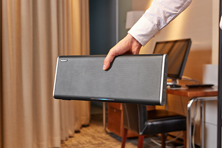 約6時間稼働する充電式の内蔵バッテリで、部屋の移動はもちろんのこと、アウトドアにも持ち出しOK。例えば、お花見やピクニックなどに「SRS-BTX500」を持っていけば、空の下でスマートフォンに保存した曲を、手軽に、しかもハイクオリティなサウンドで再生して楽しむことができる。