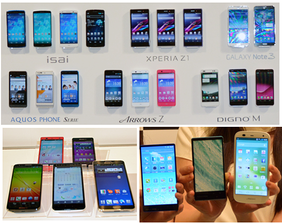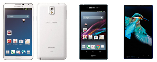 約5.7インチのファブレット「GALAXY Note 3 SC-01F」(Classic White)、約5.0インチの「Xperia Z1 SO-01F」(Black)、約5.2インチの「AQUOS PHONE Xx SoftBank 302SH」(ラピスブルー)