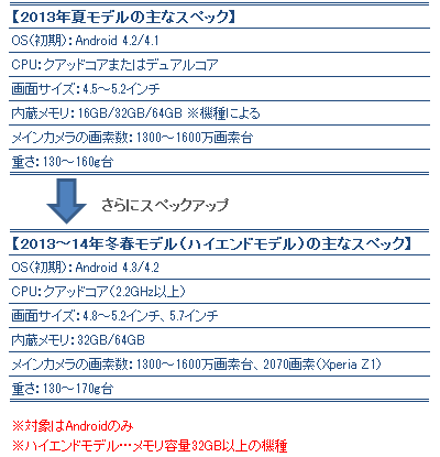 最新の2013~14年冬春モデル(auは2013年冬モデル)では、3キャリアから約5.2インチのフルHDディスプレイ搭載機種が登場。有効約2070万画素カメラを搭載した「Xperia Z1」や、スマートフォンとタブレットの間を埋める「ファブレット」として、約5.7インチのフルHDディスプレイを搭載し、付属のペンで操作するスタイルの「GALAXY Note 3」にも注目が集まっている。売れ行きや評判によっては、さらなる大画面化やカメラの高画素化が進むかもしれない。ちなみに、ディスプレイ周辺のデザイン・設計が異なるので、5.2インチなら、ワンサイズの下の5インチと横幅はほとんど変わらない。