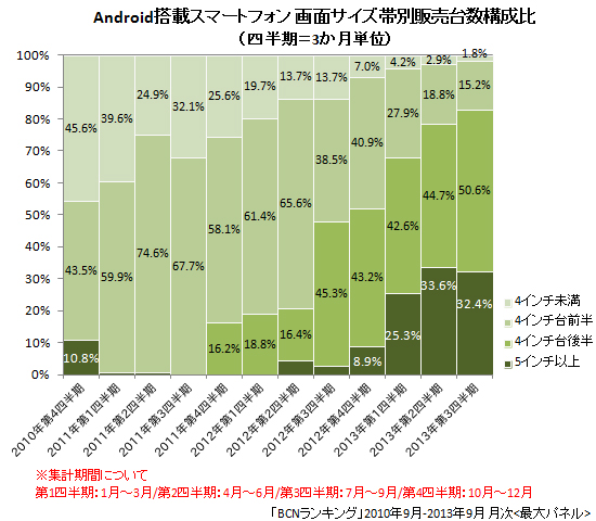 家電量販店の実売データを集計した「BCNランキング」のデータをもとに、Android搭載スマートフォンに限った画面サイズ帯別販売台数構成比を集計すると、2013年9月は、「4インチ台後半」が51.9%を占め最も多く、次いで「5インチ以上」が29.0%を占めた。月単位ではなく、3か月間の累計(四半期)ごとに集計すると、販売台数の多い画面サイズの変遷がより鮮明になり、「Xperia Z SO-02E」の発売をきっかけに、2013年第1四半期(1月~3月)から「5インチ以上」の構成比が急激に拡大しているのがわかる。