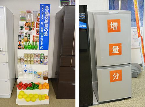 では、冷蔵庫買替えの容量シミュレーションをしてみた。例えば、10年前に容量455Lの三菱「MR-S46NE」を購入した4人家族がいたとしよう。まだ現役で使っているが、冷蔵庫の寿命は8~11年ほど。そろそろ寿命が来ると考えると、増税前のこのタイミングで買ってしまうのがお得だ。