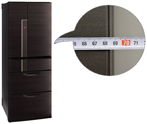 普通に考えれば、容量を増やせば増やしたぶんだけ大型化するのはあたりまえだが、三菱の「置けるスマート大容量」シリーズは、大容量でもスリム。 冷気を外に逃がさない、また外の熱を内部に進入しないように熱を遮断する断熱材を薄型化した。断熱材は冷却効率を上げるために重要な部分だが、「置けるスマート大容量」は、熱効率を変えずに薄型化した「薄型断熱構造 SMART CUBE」を採用。つまり、断熱材を薄くすることで扉や外壁などを薄くして、スリムなまま庫内を広くし、容量を増やしているのだ。
