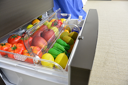 三菱はこの傷みやすい野菜に注目し、野菜室に迷子になりやすい使いかけの野菜や、ショウガやミョウガなどの香味野菜などの小さな野菜を分けて収納できる「新鮮・分けちゃう野菜室」を採用した。