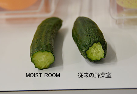 左が「MOIST ROOM」のキュウリ、右は前モデルの野菜室のキュウリ