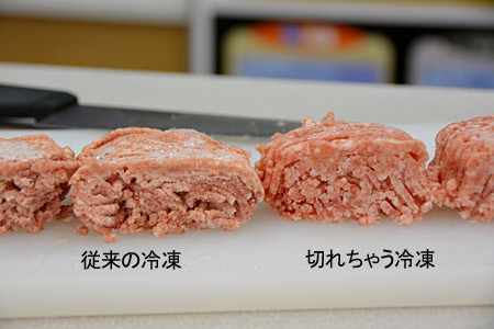 左が通常の冷凍室に保管した挽肉。右が「切れちゃう瞬冷凍」