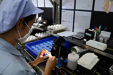 薄型テレビやパソコンの製造と異なり、1台1台の検査・調整に多くの手間ひまがかかるのが一眼レフやレンズ製造だ。ニコンタイランドでは、重要なパーツやユニットのトレーサビリティも、工程でしっかり管理している。