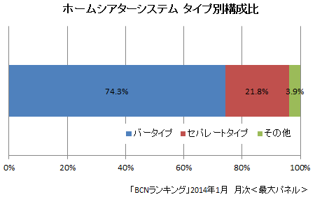 最新のホームシアターシステムの売れ筋は、設置が簡単なバータイプの製品だ。家電量販店の実売データを集計する「BCNランキング」の2014年1月のデータでは、実に74.3%がバータイプだった。このバータイプで2013年に最も売れたのが、パイオニアの「HTP-SB550」だ。