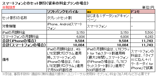 セット利用時の通信料金は、ケータイも対象になる「iPadセット割」適用時のソフトバンクが最安