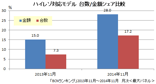 一方、14年11月は、台数ベースで17.2%、金額ベースで28.0%と大幅にアップ。特にハイレゾ対応モデルは、非対応モデルと比べて5000~1万円ほど価格が高いので、金額シェアの伸び率に影響を与え、1年間で13ポイントアップという著しい成長をみせた。