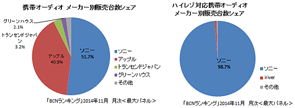 付加価値の高いハイレゾ対応モデルだが、各社の取り組みはどうだろうか。MP3プレーヤーなどを含む携帯オーディオ市場全体の14年11月のメーカー別販売台数シェアは、ソニーが51.7%、アップルが40.9%と、2社で市場を分け合っている。では、このなかのハイレゾ市場はどうなっているのか。