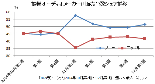 「ウォークマン Aシリーズ」の売れ行きは、携帯オーディオ市場にどのような影響をもたらしたのかをみるために、週単位でメーカー別販売台数シェアを追った。これまでソニーとアップルは、抜きつ抜かれつを繰り返しながら推移してきたが、「ウォークマン Aシリーズ」の発売日を含む11月第1週の台数シェアは、前週の45.7%から10ポイントアップの57.6%となり、一気にアップルを引き離した。