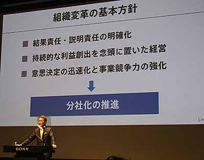 また、平井社長はエレクトロニクス事業の分社化を、さらに推進すると語った。14年7月には100%子会社の「ソニービジュアルプロダクツ」を設立し、テレビ事業を分社化したが、これに続き15年10月1日に「ビデオ&サウンド事業」について、同じく100%子会社を設立し分社化すると発表した。平井社長は「分社化自体が目的ではない」とし、「結果責任・説明責任の明確化」「持続的な利益創出を念頭に置いた経営」「意思決定の迅速化と事業競争力の強化」を狙うと説明。時期は未定としながらも、「デバイス分野」や「イメージング分野」についても、分社化を進めていく方針を明らかにした。