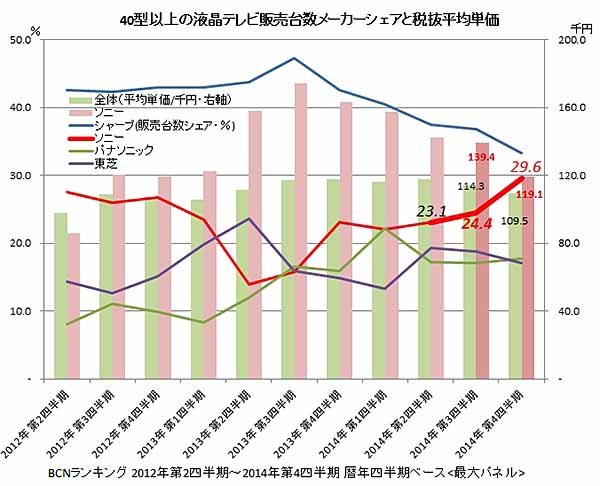しかし、このシェアの拡大は、平均単価の下落によるところも大きい。12年第3四半期(2012年7-9月)以降、ソニーの平均単価は、全体に比べて1万円以上上回る水準で推移。13年の第4四半期(2013年10-12月)では5万6千円も全体を上回っているものの、シェアは15.7%にとどまっていた。以後、4Kテレビの拡大がけん引し、シェアを上げながら高い平均単価を維持していた。ところが、4Kテレビの価格競争が激化するにつれ、価格差は縮小している。14年第4四半期では、平均単価の差が1万円を切るまで下がってきている。