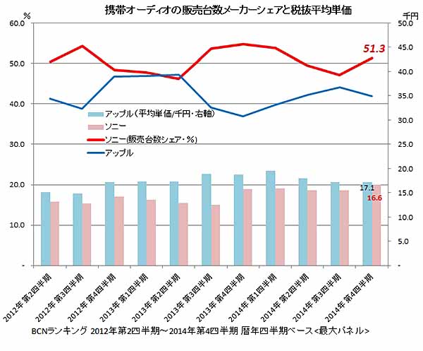 一方、分社化が発表された「ビデオ&サウンド事業」について、国内市場の現状はどうなのか。まずはウォークマンとiPodがぶつかる携帯オーディオ。ここはソニーとアップルの寡占市場で、このところソニーが過半数を占める状況が続いている。直近の14年第4四半期では、ソニーのシェアは51.3%だった。