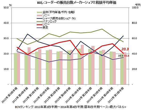 同じ「ビデオ&サウンド事業」のなかのBDレコーダー市場では、ソニーの存在感はあまり大きくない。平均単価は全体を若干上回るにすぎず、販売台数シェアも2位と4位を行ったり来たりしている状態だ。14年第4四半期の販売台数シェアは20.3%と3位に甘んじている。ただし市場全体は、底打ちがみえてきたテレビと歩調を合わせるように徐々に回復し始めている。14年第4四半期の販売台数前年同期比は、102.2%とわずかながら前年同期を上回った。