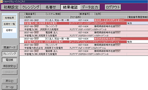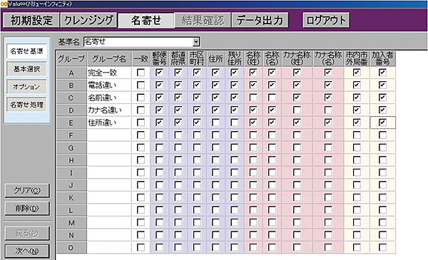 まず、顧客データの住所や郵便番号の不備などを判定してクレンジングを行い、データベースを補正する。文字表記やファイルのレイアウトなどを統一したうえで、重複したデータの名寄せ処理を実行する。名寄せには、15項目の条件を設定でき、クレンジング済みの顧客データなら、100万件のデータを約20分という高速なスピードで名寄せできるというすぐれものだ。