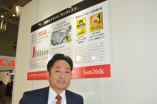 カメラと写真映像の総合展示会「CP+2015」が2月15日に閉幕した。最先端のデジタルカメラや周辺アイテムが一堂に会し、多くのカメラファンが来場した。そのなかでデジタルカメラに必須のアイテム、メモリカードの分野ではサンディスクが注目を集めていた。メモリカード市場をけん引するサンディスクは今後どの方向に市場をリードしていくのだろうか。