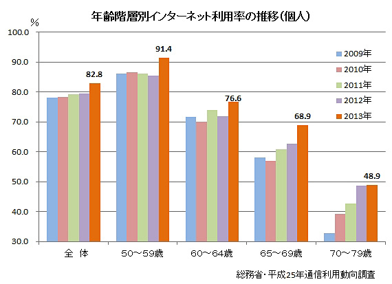 一方、総務省の「通信利用動向調査」によると、シニア層のインターネット利用率は、年を追うごとに拡大しており、「シニアでもインターネット」が、当たり前になってきている様子がよくわかる。シニアのインターネットの利用率は、それぞれの年齢で年を追うごとに広がる傾向が明確。全年齢層では直近2013年の利用率が82.8%だったのに対し、50歳代では91.4%と非常に高い結果になった。また、60歳台前半では76.6%と8割に近く、60歳代後半でも68.9%と7割に近い利用率まで拡大してきている。なかなかインターネットに縁遠そうな70歳代でも48.9%と、ほぼ半数がインターネットを利用しているのだ。