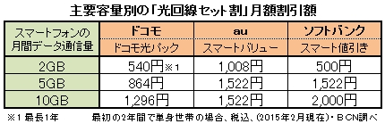 こうしたセット割で先行していたのがau。「auスマートバリュー」という名称で、auのスマートフォンなどのデータ定額サービスと、「auひかり」やケーブルテレビなどの対象固定通信サービスなどをセットで契約すると、スマートフォンの利用料を割り引くというものだ。NTTドコモも3月から「ドコモ光パック」という名称でドコモのスマートフォンなどのデータ通信定額サービスと光通信サービス「ドコモ光」をセットにすることで、合計金額を割り引く制度を始める。