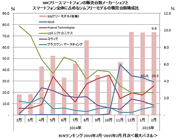 現在、日本のSIMフリースマートフォン市場は拡大の一途にある。家電量販店の実売データを集計する「BCNランキング」で、スマートフォン市場のなかのSIMフリースマートフォンの構成比をチェックした。2014年2月時点の販売台数シェアは、わずか2.4%に過ぎなかったが、今年の2月には9.8%に拡大し、わずか1年でシェアは4倍に膨れあがった。