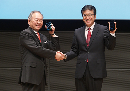 「VAIO Phone」を手に固い握手を交わす日本通信の三田社長(左)とVAIOの関取社長
