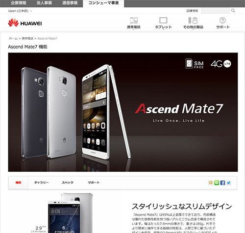 ファーウェイ「Ascend Mate7」(税込実勢価格5万円台半ば)