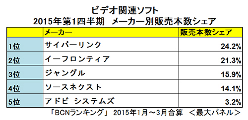 「BCNランキング」が集計するビデオ関連ソフトは、ビデオ編集、ビデオ再生、変換、編集から変換、再生まで1本でできるビデオ統合と複数ジャンルがわかれている。これらを合わせたビデオ関連ソフト市場全体で、2015年第1四半期のメーカー別の販売本数シェアをチェックした。