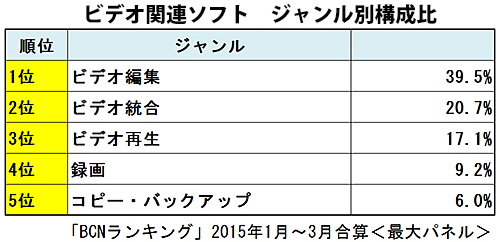 ビデオ関連ソフト全体の2015年1月~3月を合算したジャンル別の構成比では、編集が39.5%でもっとも高かった。編集、変換、再生、ライティングまで1本でできる統合ソフトは20.7%、再生ソフトが17.1%だった。