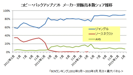 メーカーシェア推移を見てみよう。ちょうど3年前の2012年3月からコピー・バックアップソフトのメーカー別販売本数シェアを見ると、「DVDFab」シリーズを販売するジャングルが実に37か月間、ずっと1位をキープし続けている。