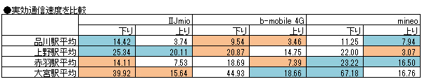 今回最も好成績を収めたのはau系格安SIMカードのmineo。平均値で下り22Mbpsを超える通信速度を、上野、赤羽、大宮駅の3ヵ所で記録した。平均で20Mbpsを超えたのはかなり優秀な下り通信速度と言える。スマートフォンのほとんどのアプリケーションを快適に利用できるだろう。
