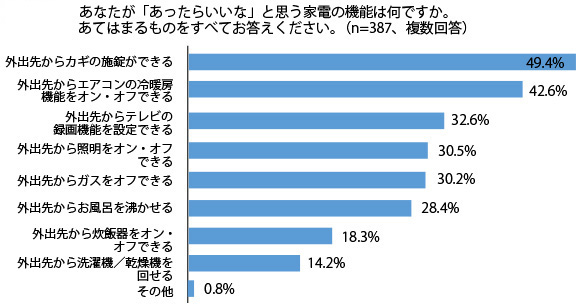 アンケート結果によると、留守番をしているペットの健康状態が心配であり、帰宅時に快適な状態にある自宅に帰りたい、など理由で、外出先からエアコンのオン・オフをコントロールしたい人が多いことがわかった。