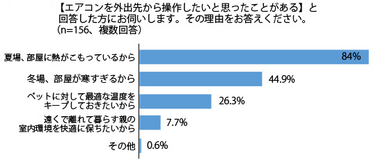 「エアコンを外出先から操作したいと思ったことがある」人を対象に、その理由を質問したところ「夏場、部屋に熱がこもっているから」と回答した人が84%を占めた。
