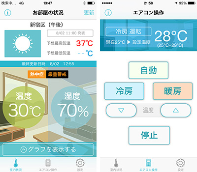 部屋の温度/湿度を確認したり、オン/オフ、温度調整ができる