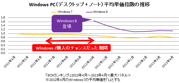 2012年にWindows 8の正式リリースが発表されると、当時の現行OSであるWindows 7搭載モデルは、徐々に価格が下落した。Windows 8搭載モデルが店頭にお目見えすると、その価格差が明らかに開いた。今回も同様の流れができつつあり、Windows 8搭載モデルはこの夏に底値に近い状態になる可能性が高い。