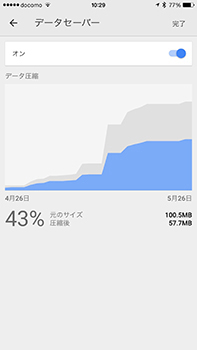 これは筆者のメインスマホのiPhone 6 Plusでの例。一月のウェブブラウジングにおいて、本来のデータ通信量が100.5MBのところ、57.7MBに圧縮されたデータをダウンロード・表示していたことによって、データ通信量を43%節約できた