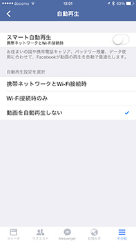 iPhone用Facebookアプリでは「その他→アカウント設定→動画と写真→自動再生→スマート自動再生→動画を自動再生しない」、Android用Facebookアプリでは「メニュー→アプリの設定→動画自動再生→オフ」としておけば、動画が自動再生されることはなくなる。なお、「Wi-Fi接続時のみ」に設定しておけば、自宅の無線LANルーターや公衆無線LANサービスに接続している時のみ、自動的に動画を再生させることも可能だ。