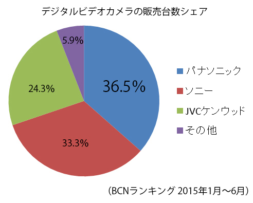 BCNランキングの2015年上半期(1~6月)は、デジタルビデオカメラ部門でパナソニックが“王者”ソニーの牙城を切り崩してトップの座を射止めた。両社のシェアは、1位のパナソニックが36.5%、2位のソニーが33.3%で僅差の勝負だった。