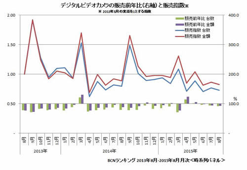 デジタルビデオカメラの販売縮小が徐々に底を打ち始めた。2013年8月比でみると、販売台数はこの8月で0.73、販売金額は0.82と市場は大きく 縮小してきた。前年比では前年割れ基調ではあるものの、徐々にそのマイナスが小さくなっている。例えば14年8月の販売前年比は台数で79.6%、金額で 88.5%と、大きく二ケタ割れの水準だった。ところがこの8月では、台数91.7%、金額93.2%と一ケタ台のマイナスにとどまった。平均単価の上昇 による販売金額の底打ち感は強い。4K化が従来のデジタルビデオカメラだけでなく、伸びているカテゴリーであるアクションカムでも進んでいることが大き い。