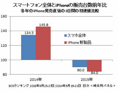 2013年にドコモが販売を開始し主要キャリアすべてで取り扱いが始まったiPhoneは、この年のiPhone 5s/5cで飛躍的に販売台数を伸ばした。さらに、2014年のiPhone 6/6 Plusでは、初めて画面サイズを2ラインアップで展開したことで、さらに売り上げを拡大させた。iPhone 6s/6s Plusでは、このような目新しい展開が乏しい。初速では前年比84.0%と前年を大きく下回っている。しかし、A9チップの搭載でパフォーマンスが7割 向上し、タッチパネルの押し込みの強さを識別する「3D Touch」など、基本性能は確実に向上しており、今後の販売動向に注目していきたい。