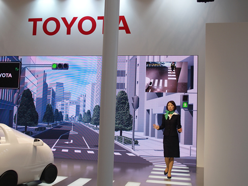 SMC2015では、各社が次世代の交通システムについて展示している。トヨタは「ITS Connect」のデモコーナーを実施、交差点に設置したカメラと無線装置を使って車に注意喚起をするシステムのしくみを説明している。