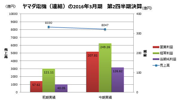 中間期(15年4~9月)の連結売上高が、8047億円(同96.6%)と前年を下回ったものの、営業利益は207億8100万円(同360.6%)、経常利益が249億2600万円(同205.8%)と大幅に伸びた。