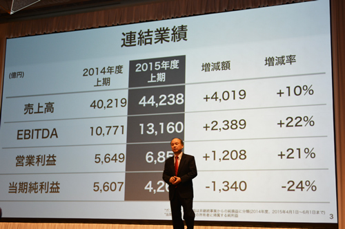 ソフトバンクグループは11月4日、2016年3月期の中間期連結決算を発表した。売上高は前年同期比10%増の4兆4238億円、営業利益が同21%増の6858億円だったが、純利益が米スプリントの不振などが影響し同24%減の4267億円だった。スプリント以外では、グループの柱となる国内通信事業が堅調に推移し、携帯電話契約数が増加したことなどが牽引した。